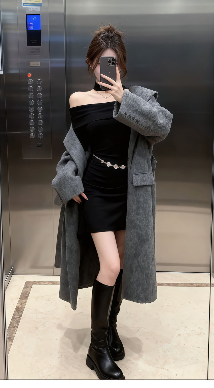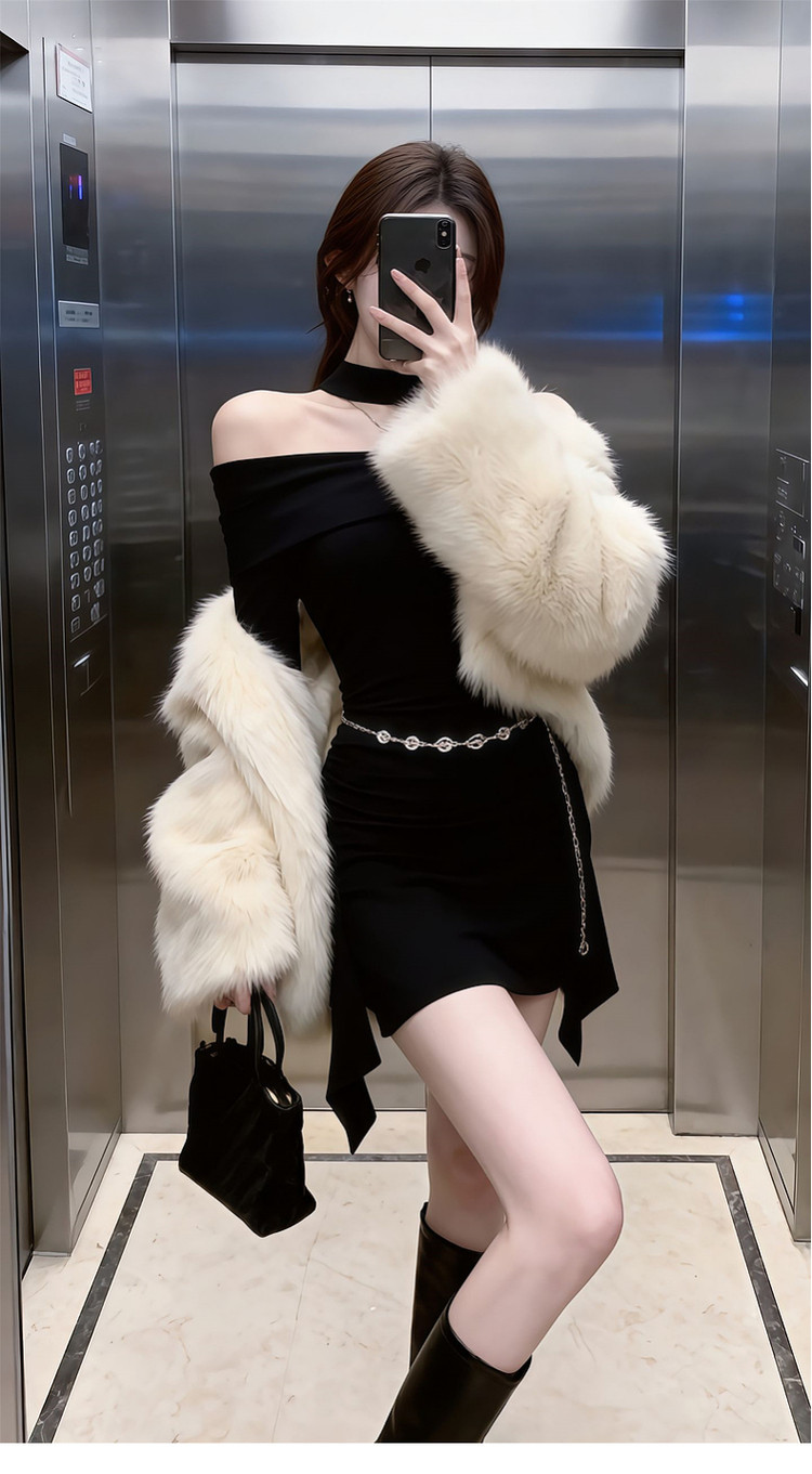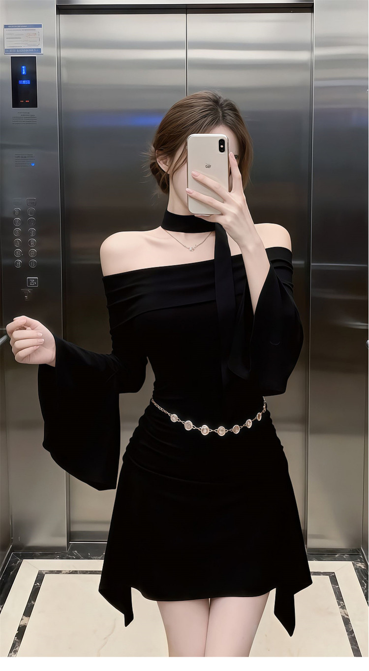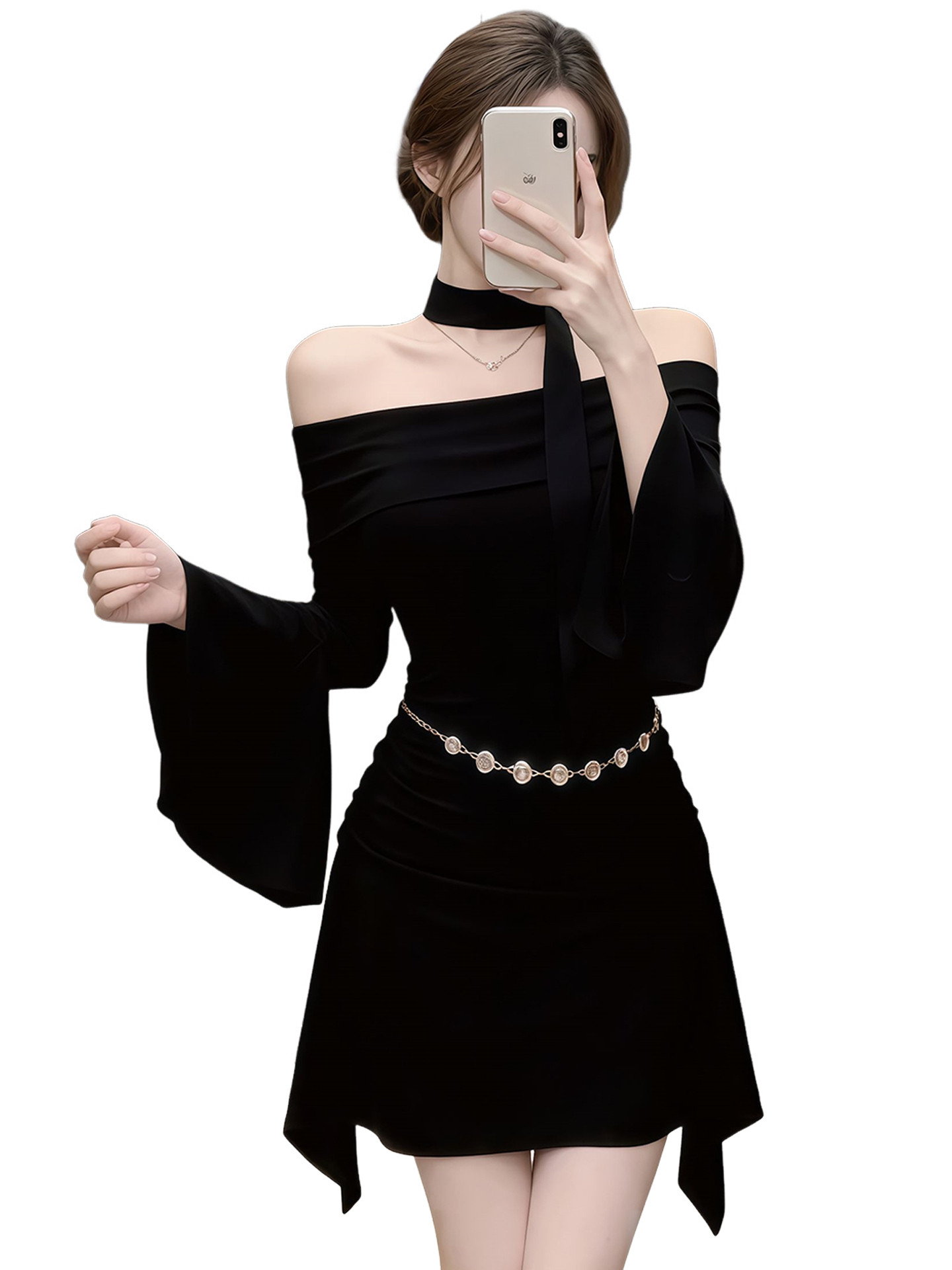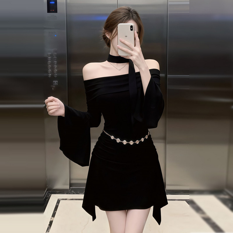 2025 new black high-end royal sister style one-shoulder dress women's autumn and winter waist slimming short skirt