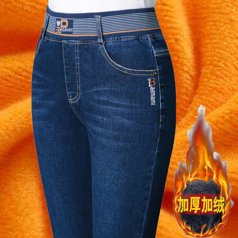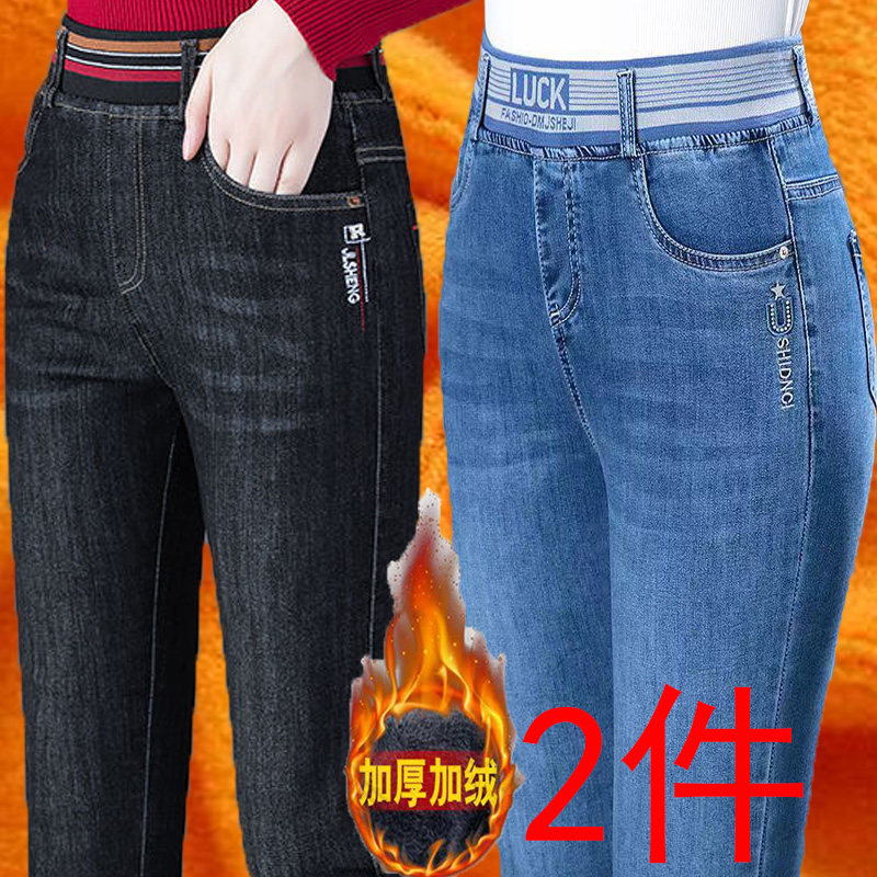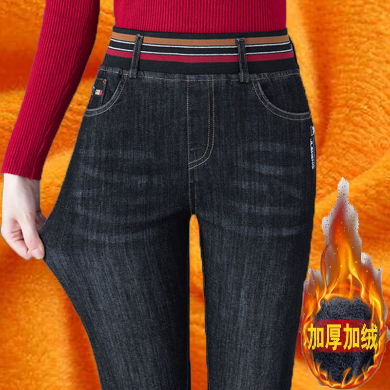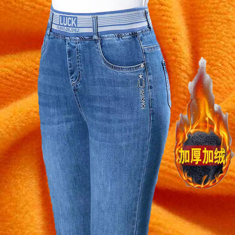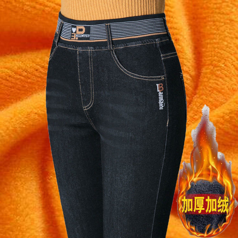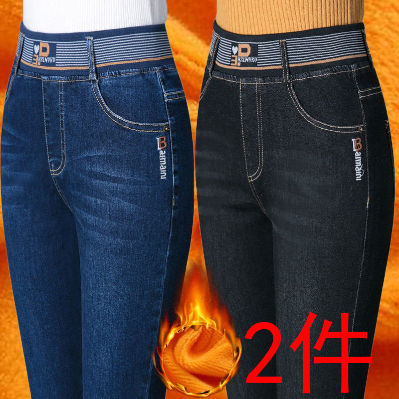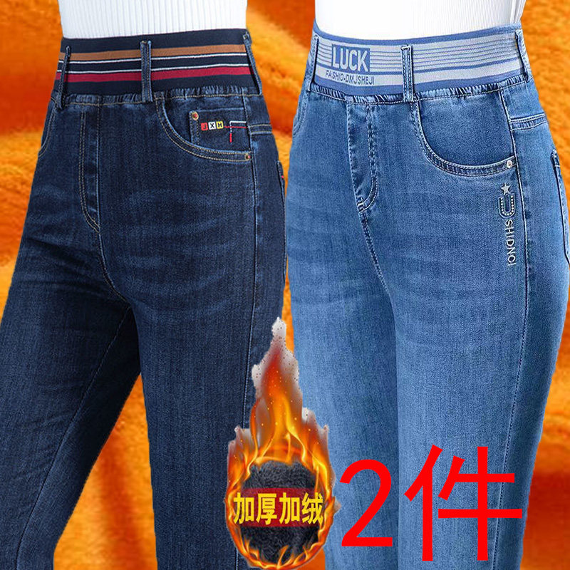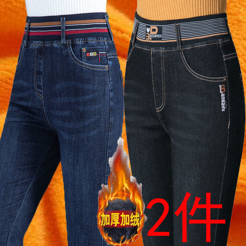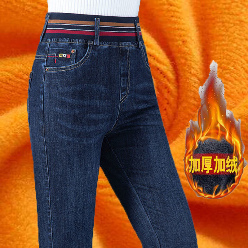 Fleece padded high-waisted jeans, women's winter straight stretch elastic waist, slim slim skinny plus-size loose long pants