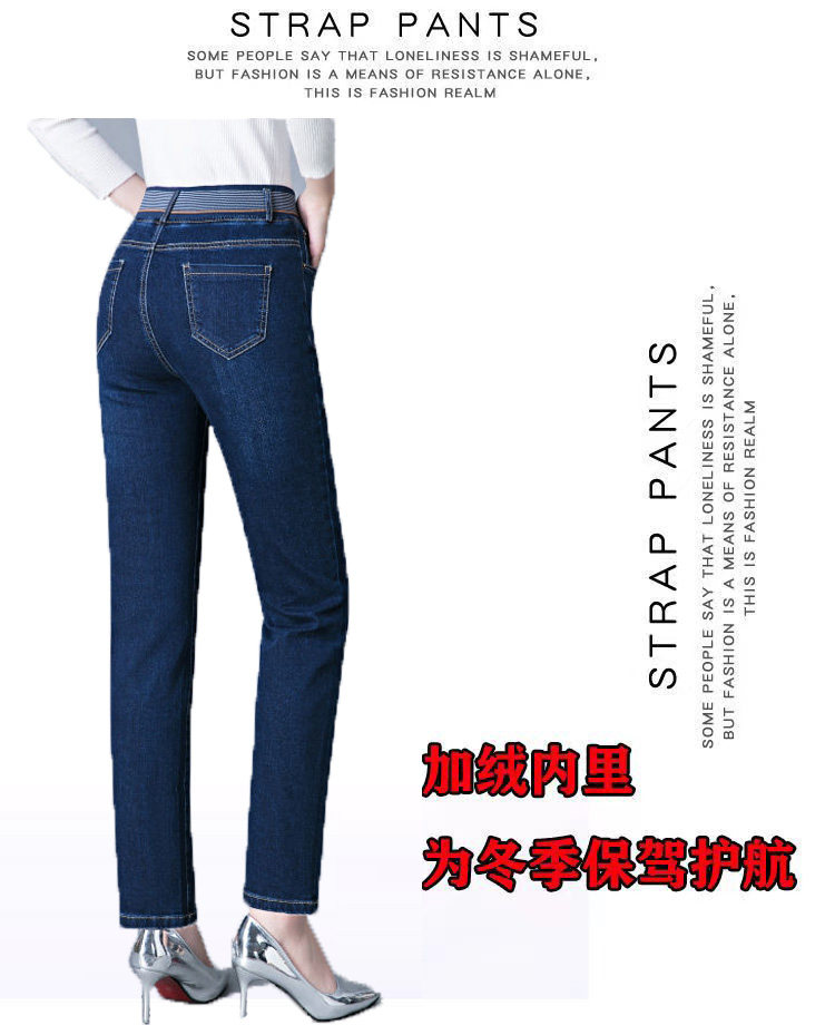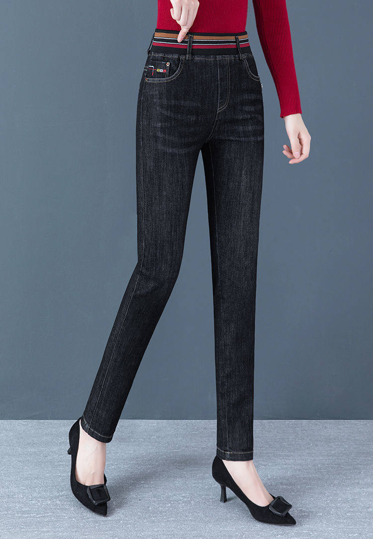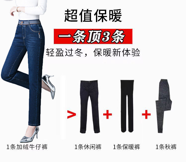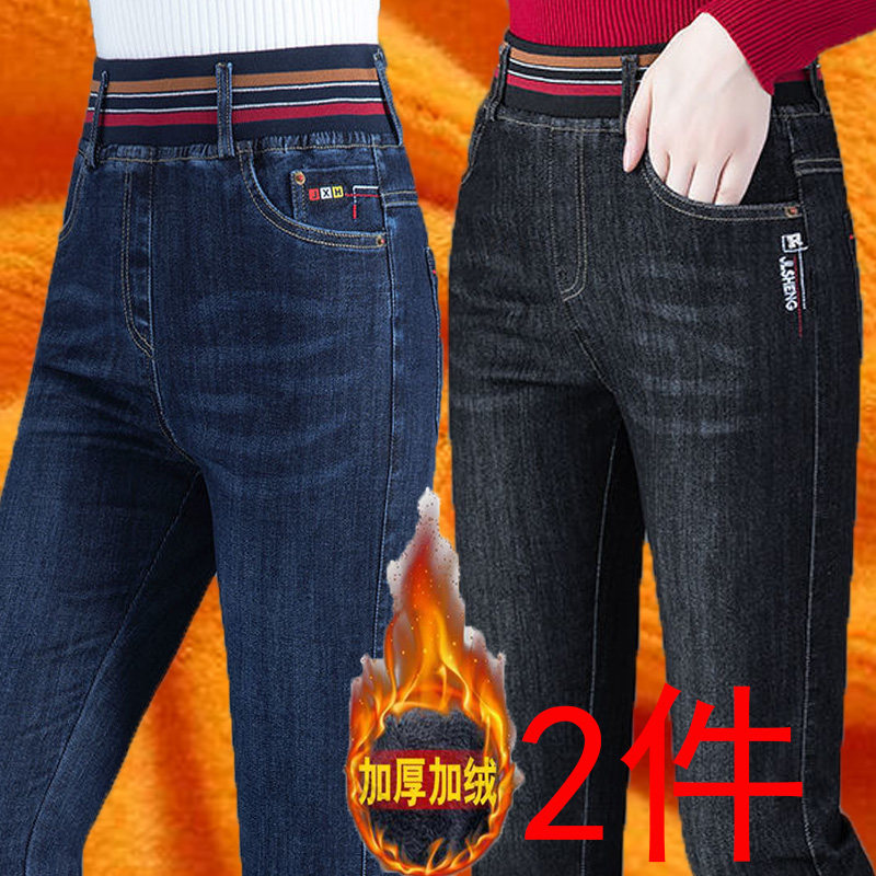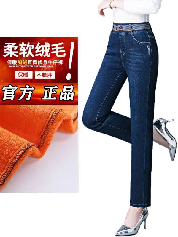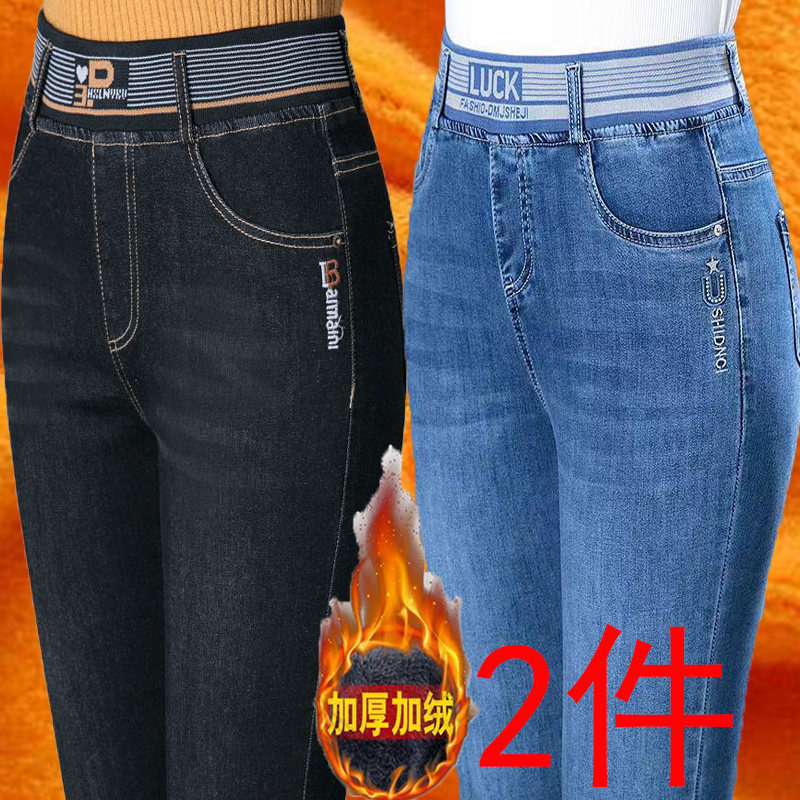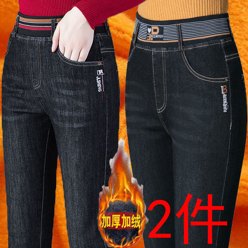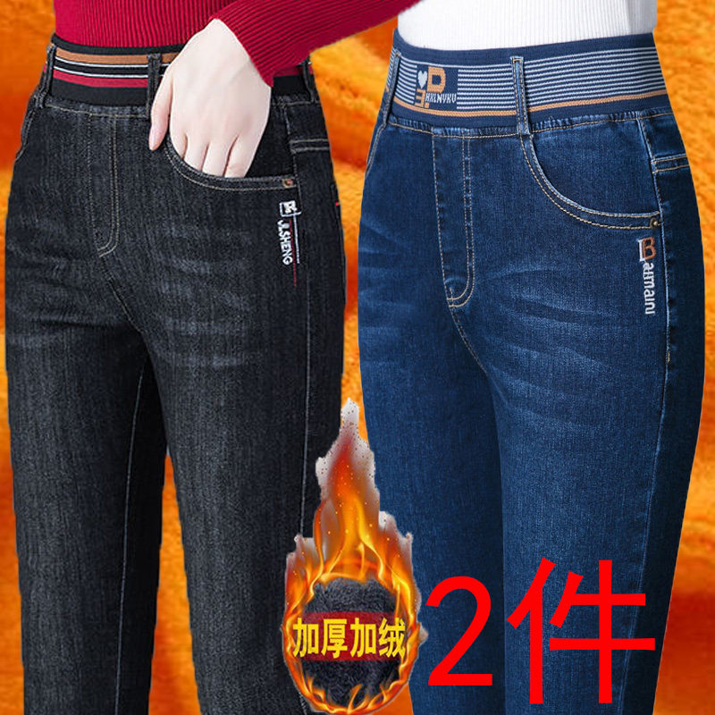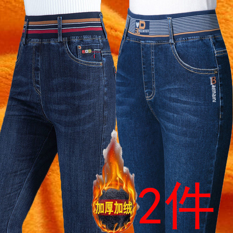 Fleece padded high-waisted jeans, women's winter straight stretch elastic waist, slim slim skinny plus-size loose long pants