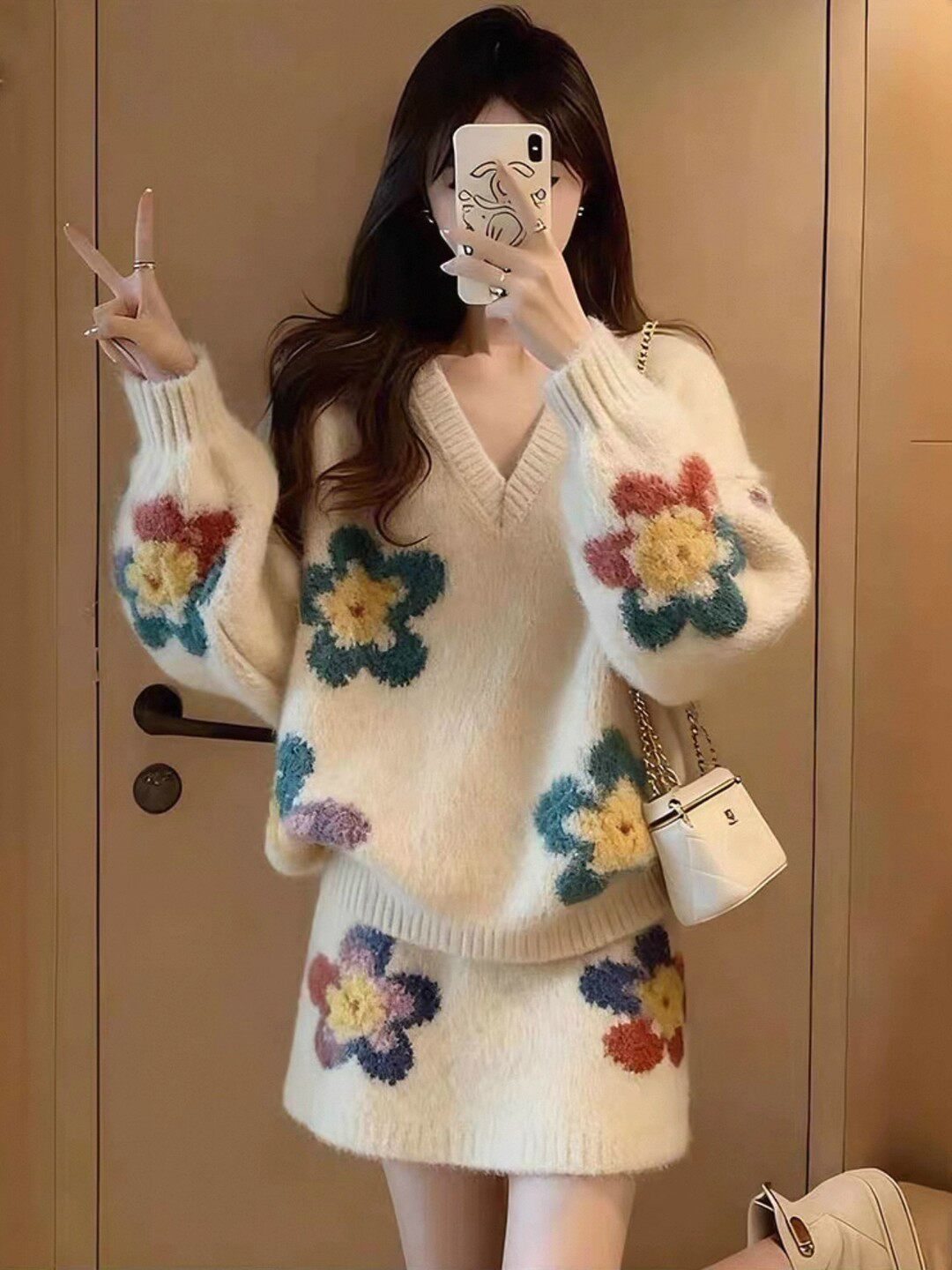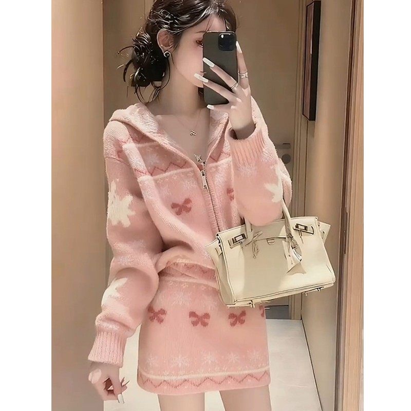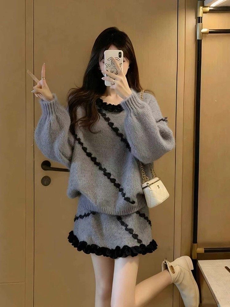 French purple knitted suit women's 2025 new autumn and winter lazy style outfit with a complete set of sweaters and short skirts, two-piece set